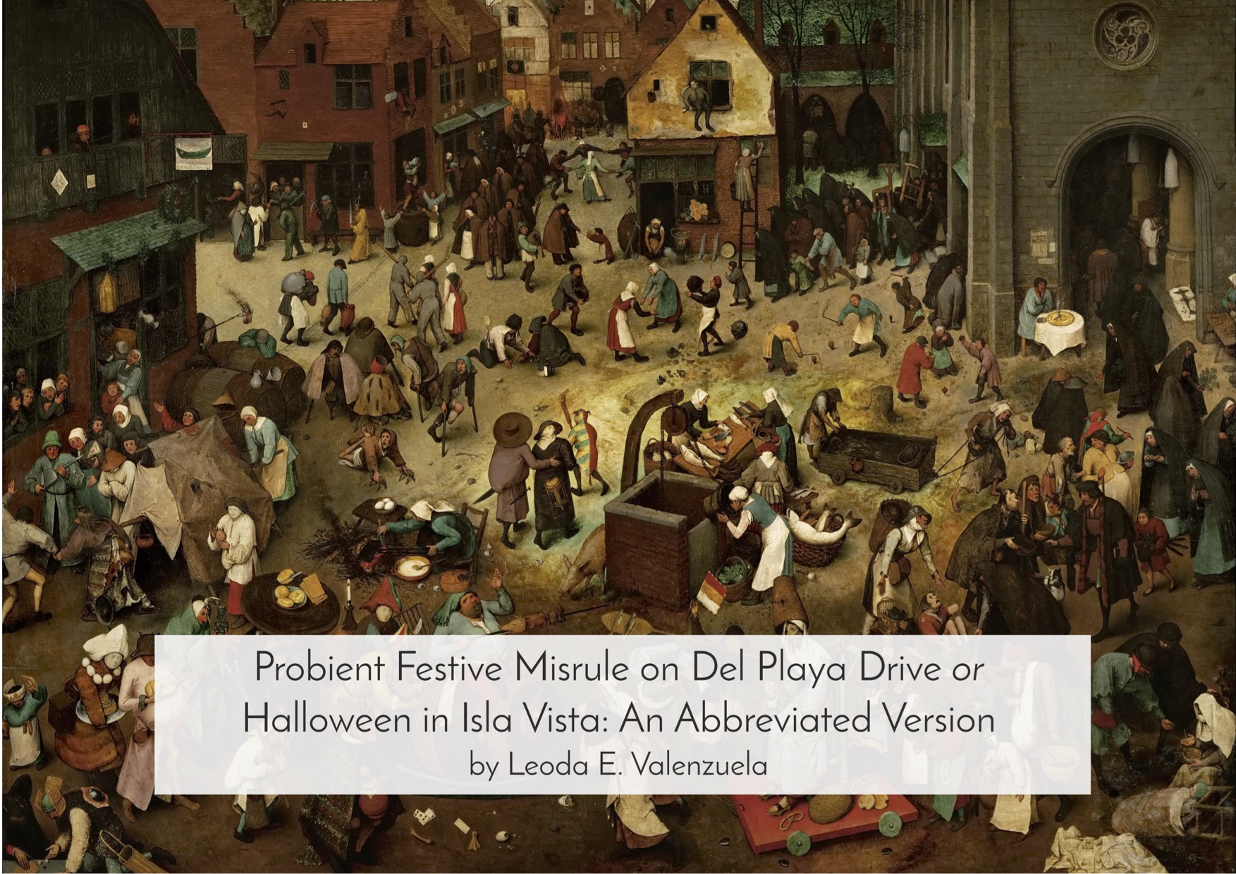 Del Playa Drive is a difficult walk and an impossible drive on Halloween weekend nights in Isla Vista. If one is walking and there is a crowd big enough, one can be squeezed, lifted and whirled around in and out of a sea of bodies. Anonymous scantily or elaborately dressed princesses, firefighters, mummies and sexy black cats flirt, shout from balconies, laugh, and tread on gravel, red cups, costume feathers and horse excrement. The damages that are the result of the liberal spirit of those nights have led apprehensive local law enforcement officials into developing costly crowd control and safety preparations; and have led UCSB to implement strict residence hall policies. Both of these official responses in turn create disgruntled Santa Barbara taxpayers and student resentment. In the dialogue that ensues in the aftermath of Halloween in Isla Vista, taxpayers blame the “party school” UCSB for misusing a significant portion of the county’s resources and students blame out-of-towners for “trashing” their home. It is tradition for news outlets to speedily report the damages of the yearly, unsanctioned event. These conflicts are very real; this essay however, will focus on how the topsy-turvy nature of Halloween in Isla Vista reflects national culture functioning at a local level in this college-town. Modernity, consumerism, local politics, and American youth ideology are cultural factors that are reflected and also heavily explored in the event through humor, speech and the body creating a potential for social change. A close analysis of participant performances based on Carnivalesque and English medieval drama studies provides such insight.